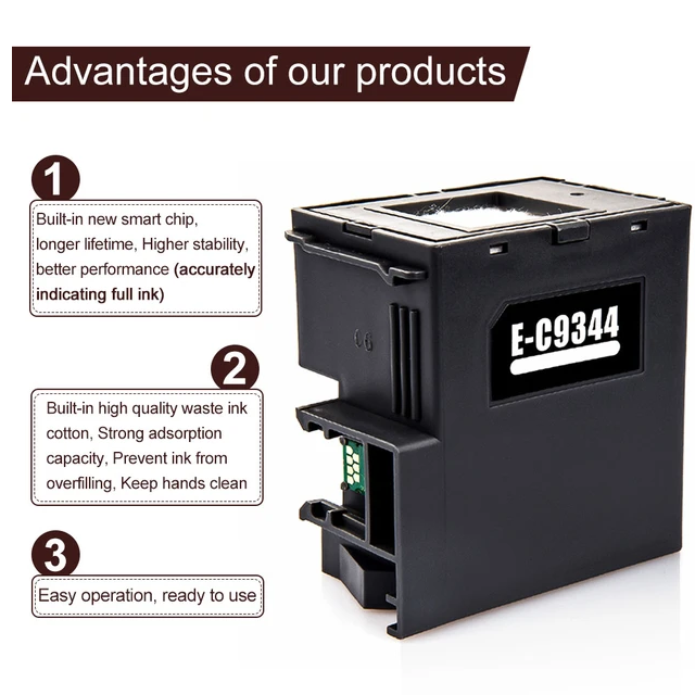 High-quality compatible-Import with Epson C9344 Maintenance Box (C9344-T212) Epson C9344-T212 Ink Maintenance Box 100% Compatible with Epson Expression Home XP-2100, XP-2105, XP-3100, XP-3105, XP-4100, XP-4105, WorkForce WF-2830, WorkForce WF-2850, EcoTank L3550, EcoTank L3556, EcoTank L3560, EcoTank L5590, WF-2810 / WF-2810DWF / WF-2820 / WF-2820DWF / WF-2830 / WF-2850 / WF-2851 / WF-2930 / WF-2950 / L3550 / L3556 / L3560 / L5590 / XP-2150 / XP-2155 / XP-3100 / XP-3105 / XP-3150 / XP-3155 / XP-3200 / XP-3205 / XP-3250 / XP-3255 / XP-4100 / XP-4101 / XP-4105 / XP-4150 / XP-4155 / XP-4200 / XP-4205 XP-4250 / XP-4255 EcoTank All-in-One Printer