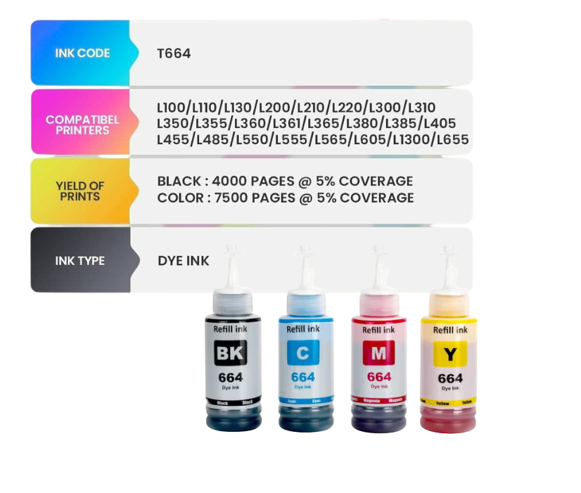 The T664 – 664 Ink Bottle 70ml (C-M-Y-B Set) is a reliable ink solution that is of the highest quality, suitable for different Epson Ink Tank printers. This set of ink contains everything you need to produce beautiful colored prints as well as crisp black texts. The ink set is available at Printer Partner, ensuring smooth operation of your printer as well as quality prints for your home, office, and business needs.