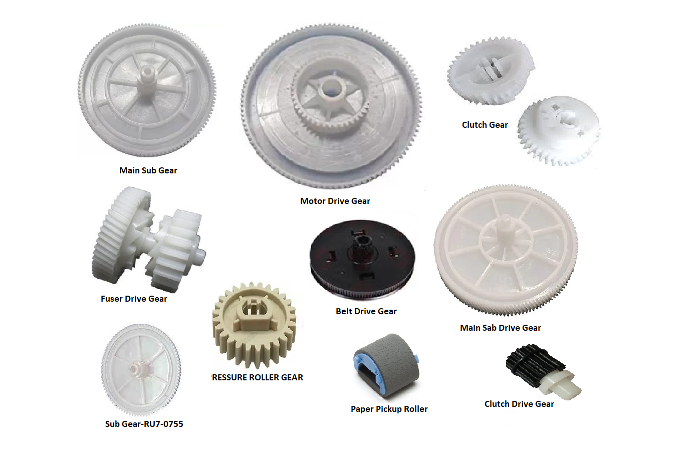 The replacement Ink 10 Pcs Gear set is a Perfect Part that ensures smooth paper feeding, reduces misfeeds, and keeps your printer functioning efficiently. Pressure Roller Gear, Clutch Drive Gear, Fuser Drive Gear, Clutch Gear, Pickup Roller, Main Sub Gear White, Belt Drive Gear, Main Sub Drive Gear, Moter Drive Gear, Main Gear Black, Fuser Bush.